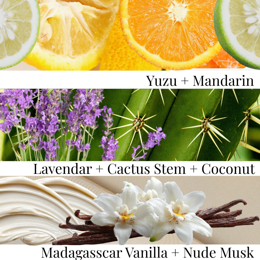 A fresh, sparkling composition that feels clean, soft, and uplifting. Bright citrus opens the fragrance before airy florals and creamy coconut unfold, settling into a smooth veil of vanilla and soft musk that lingers beautifully on the skin.